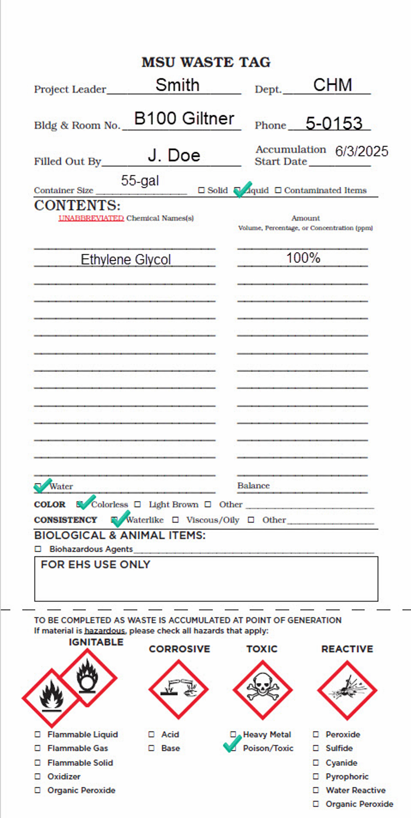 All chemical constituents must be accounted for on the MSU Waste Tag. Chemical names must be printed legibly, in English, and with no abbreviations. The amount of chemical constituents can be captured by either using percentages up to 100%, or by units of volume. Either way, these need to match the amount of waste in the container when EHS arrives to pick up the material. Inaccuracies and discrepancies on the MSU Waste Tag can result in the waste being rejected by the EHS Hazardous Waste Staff for safety and compliance reasons. For aqueous solutions, the check box for “Water Balance” can be used to account for the remaining percentages or volume. Chemical constituents must be identified on the MSU Waste Tag as they are added to the container, as guessing the contents of a full container creates safety and compliance violations.