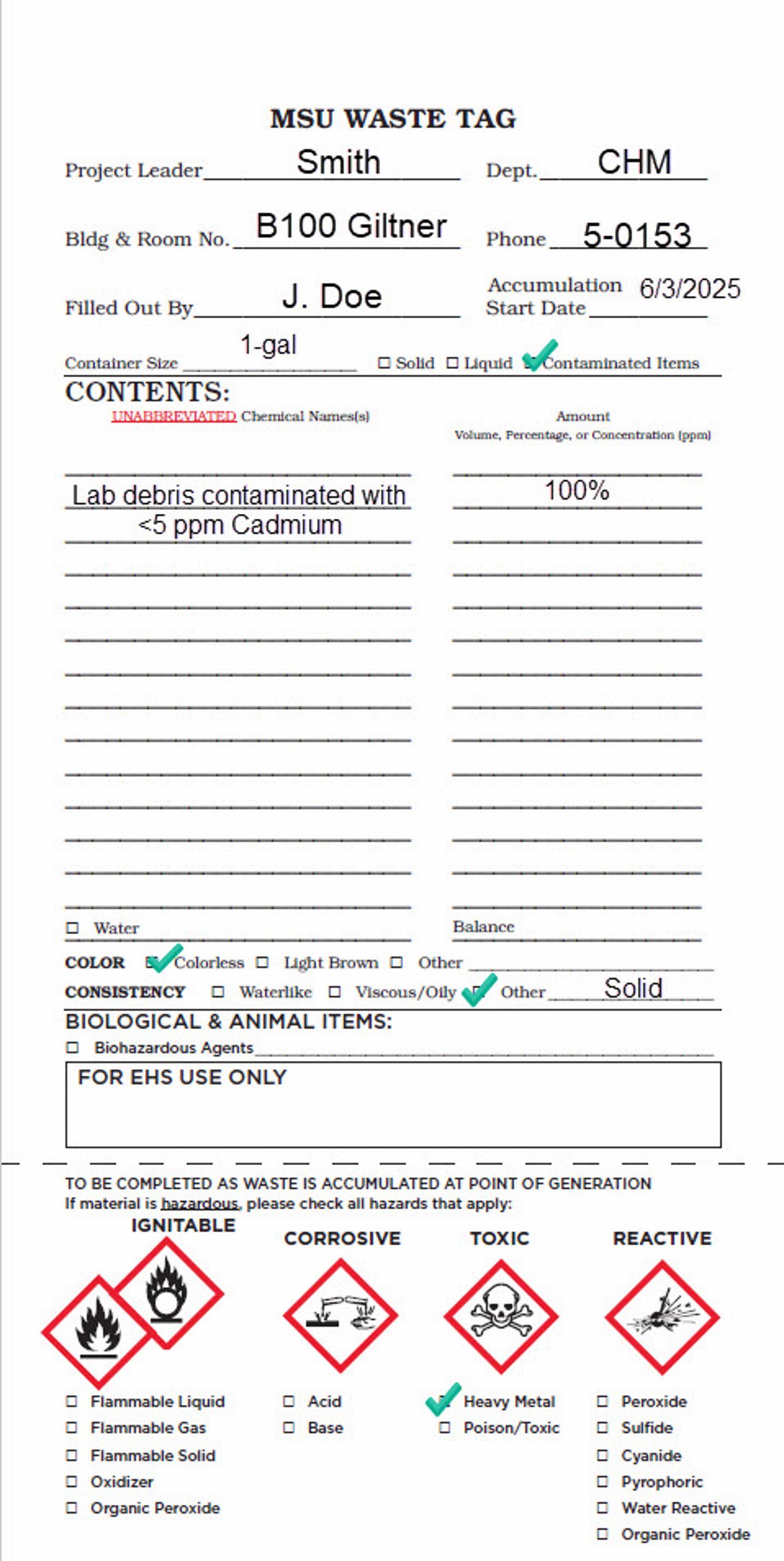 The contact information at the top of the MSU Waste Tag must be filled out to identify where the hazardous waste was generated, the container size and type, and who to contact with questions regarding the waste container.